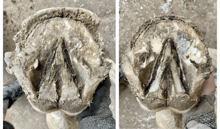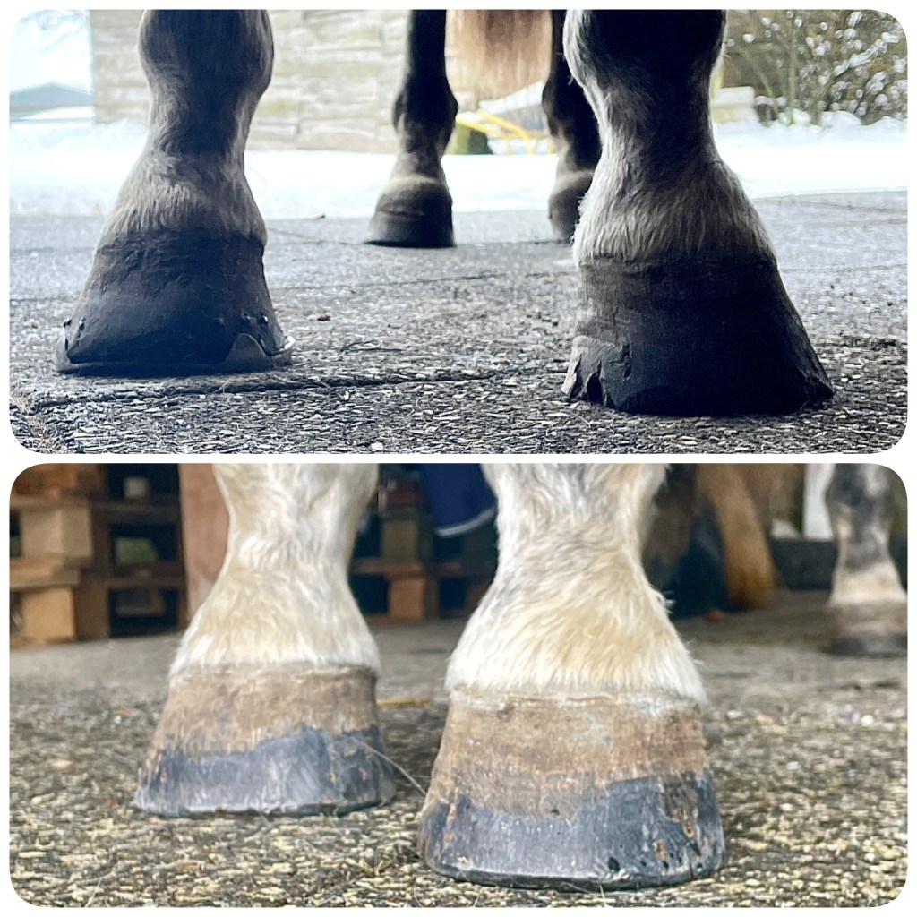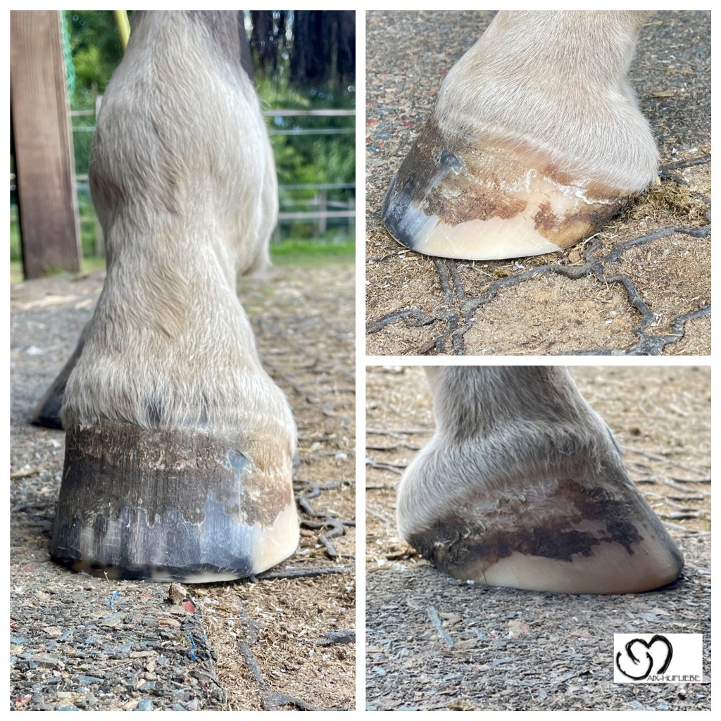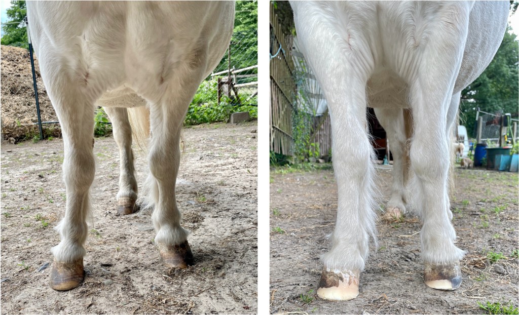 Beide Hinterhufe zeigen deutlich abgelaufene Zehen, da die Hinterbeine beim Abfußen nicht richtig hochgehoben werden und die Zehenspitze dadurch häufig über den Boden schleift.