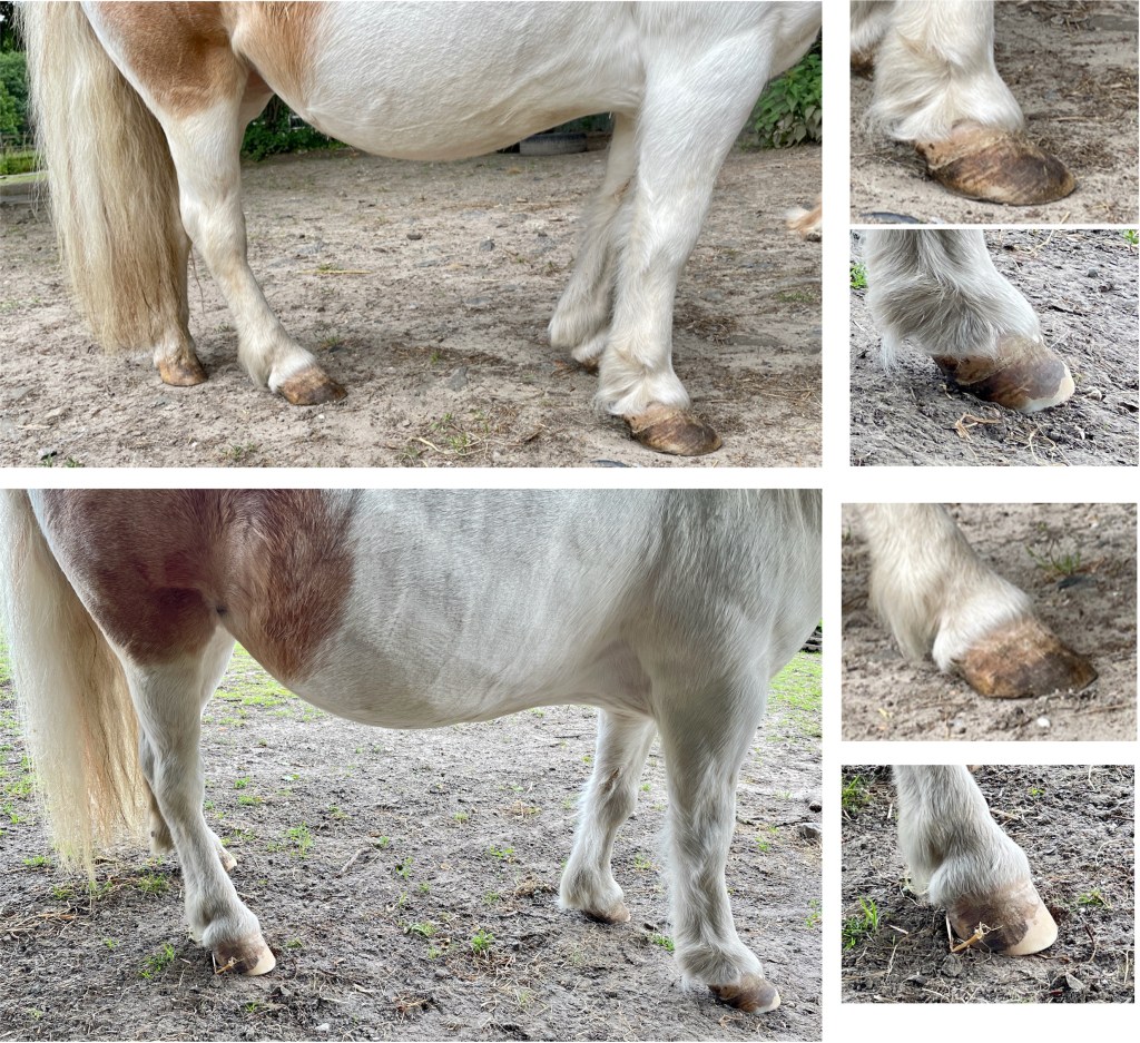 Dieses Pony hatte in der Vergangenheit mit Rehe zu kämpfen und es gab immer wieder zu lange Intervalle zwischen den Hufbearbeitungen. Dadurch sind alle Hufe extrem lang und flach geworden. In solchen Fällen wähle ich in der Anfangszeit gerne kürzere Intervalle zwischen den Bearbeitungsterminen. Hierdurch lässt sich schneller eine positive Stellungsveränderung erzielen, ohne Sehnen und Gelenke zu sehr zu belasten.