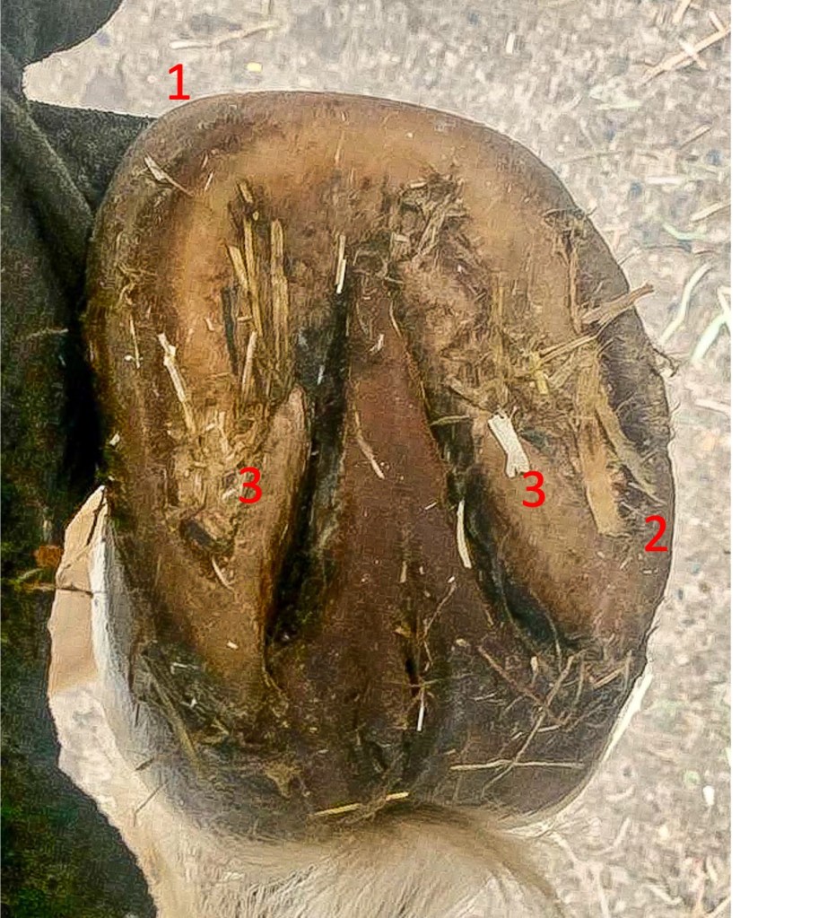 Vor der ersten Bearbeitung, der Huf ist sehr schmal und langgezogen. Die Rotation hat deutliche Spuren am Huf hinterlassen, er ist ebenfalls nach innen verdreht. 1: deutlicher Zehenabweiser an der Innenseite (der Tragrand ist dort breiter und höher als an der Außenseite), 2: der Tragrand im äußere Trachtenbereich ist ebenfalls breiter und höher als der Innenseite, 3: deutlich ausgeprägte Eckstreben, die den Strahl bereits beeinträchtigen.