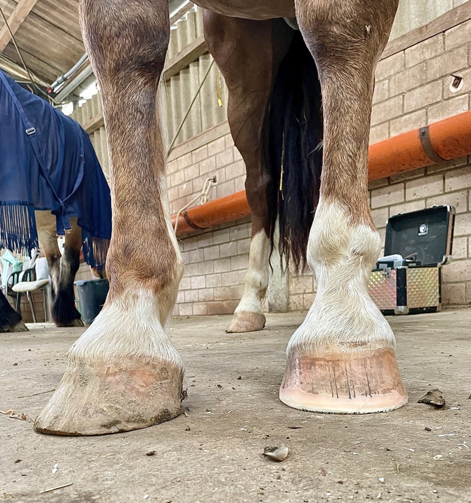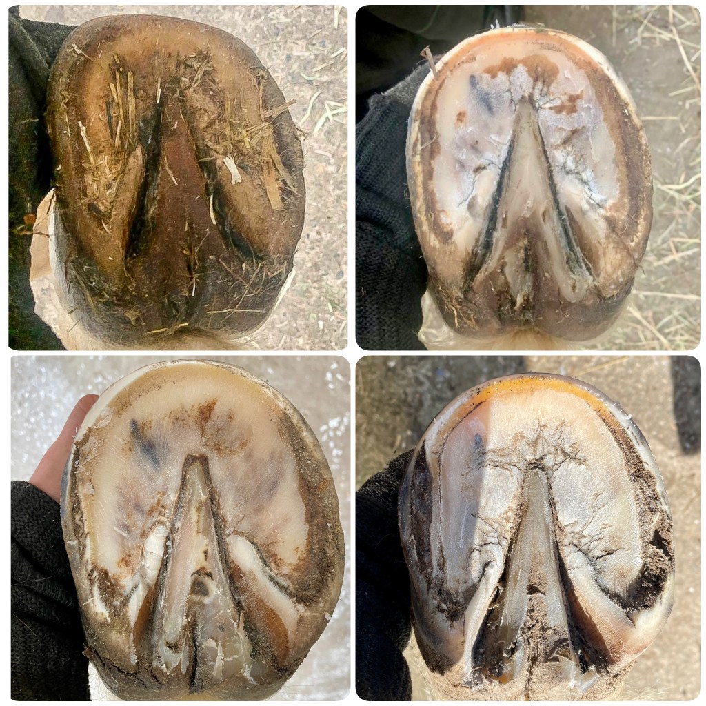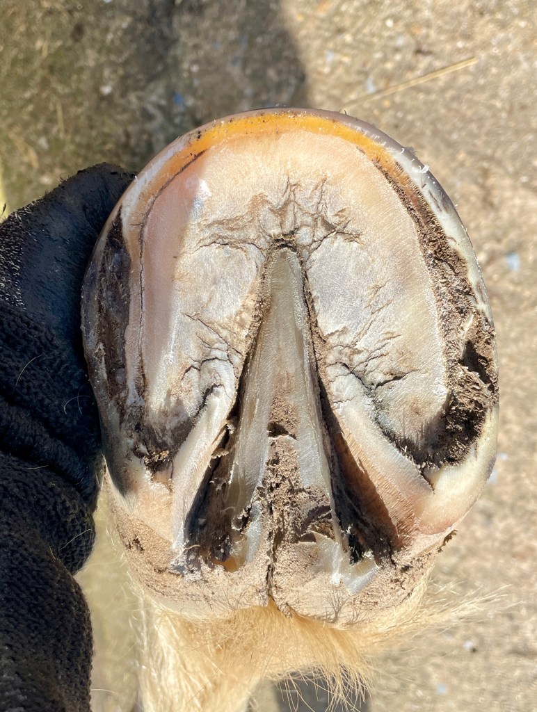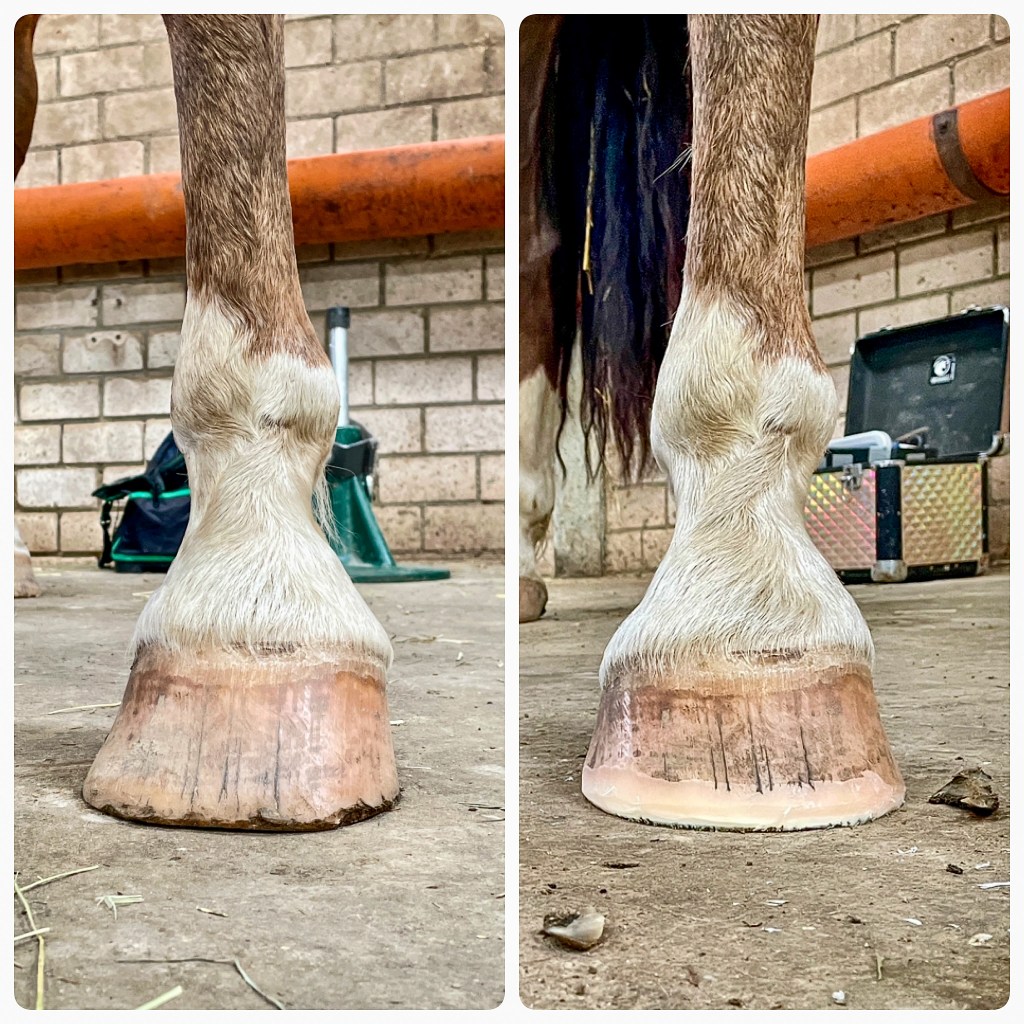 Bei diesem Pferd kamen erstmal die Eisen ab und ich habe die erste Hufbearbeitung durchgeführt. Fokus lag auf dem Freilegen der funktionalen Sohle, Beseitigung der äußeren Hebel und einem gleichhohen/geraden Tragrand.
