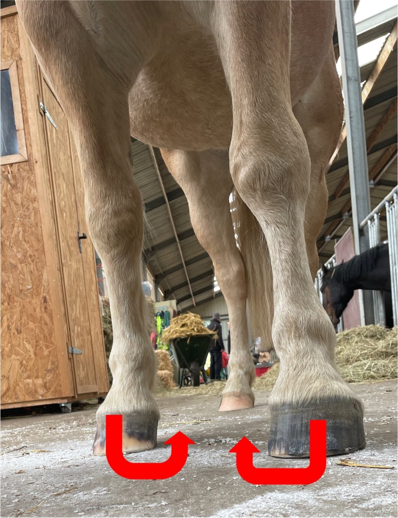 Durch die Bodenweite Gliedmaßenstellung der Vorderbeine, wurde die Innenseite der Hufe mehr belastet. In der Folge wurden die äußeren Hufwände immer länger. Nach der Bearbeitung stehen die Vorderbeine wieder paralleler, innere und äußere Hufwand sind gleich lang und ermöglichen einen plane Fussung.