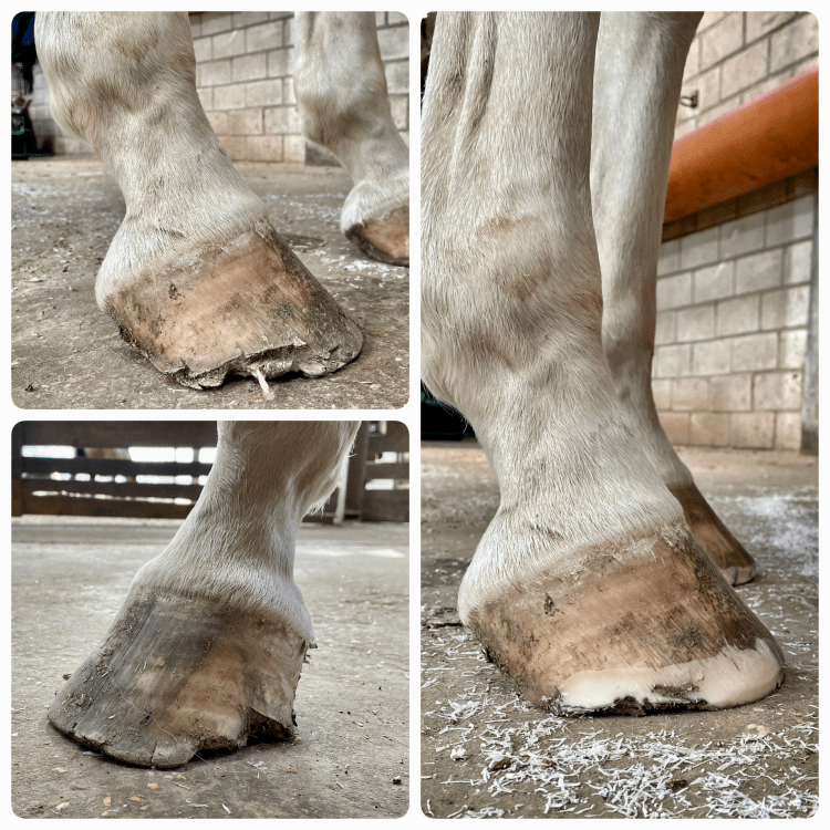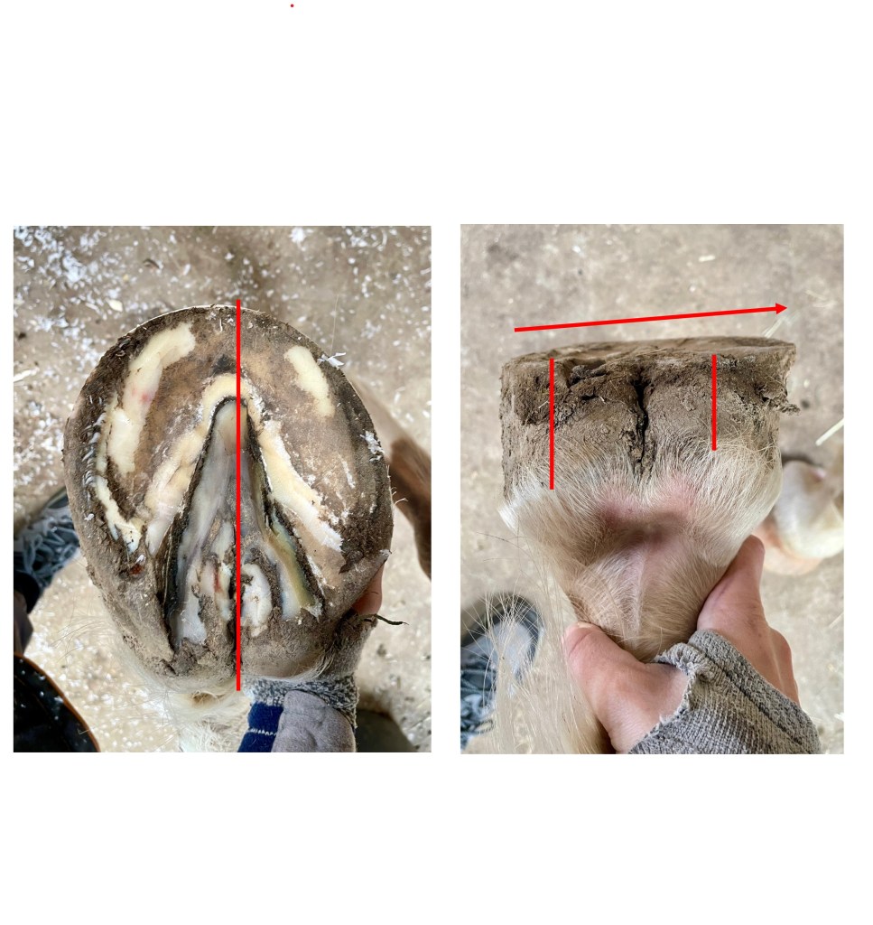 Das Pferd steht deutlich zu flach, die Zehe war viel zu lang und es bestand Innen auf beiden Seiten ein starker Hebel. Zusätzlich sind die Hufe schief (verkippt und rotiert).
